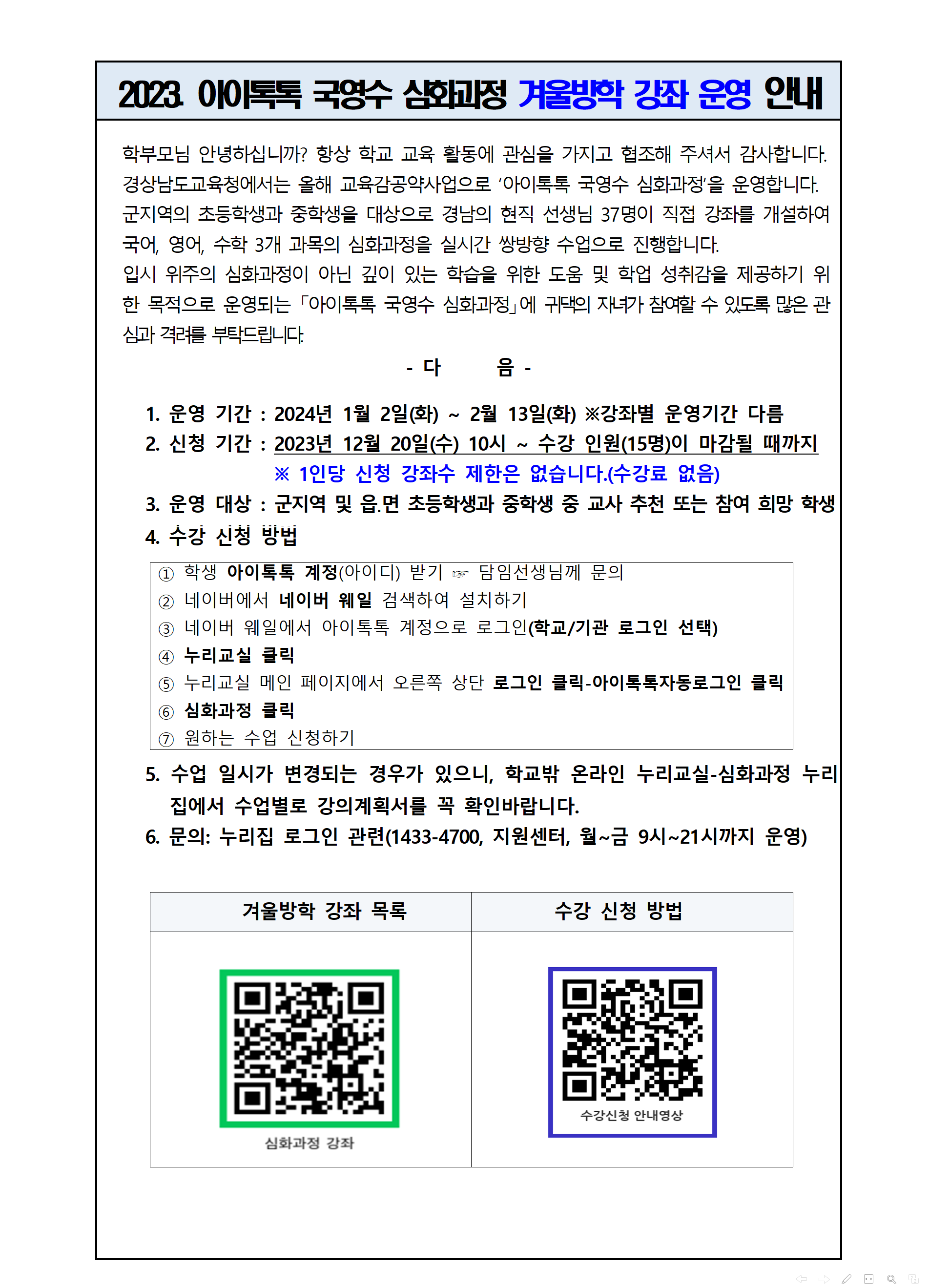 2023. 아이톡톡 국영수 심화과정 겨울방학 강좌 운영 안내