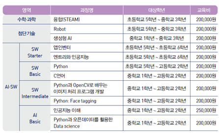 1. 교육대상 - 전국 초등학생(5~6학년), 중학생, 고등학생 2. 지원자격 - 수학, 과학, AI·SW 분야에 높은 관심과 흥미를 가진 도전적이고 열정적인 학생 3. 학습방법 - KAIST 튜터와 함께하는 온라인 학습활동 - e-Book 혹은 동영상으로 개념을 학습하고 탐구 프로젝트 수행을 중심으로 한 자기주도학습 ※ 교육자료의 형태(e-Book or 동영상)는 과정에 따라 다를 수 있음 - 학습 결과에 대한 개별 맞춤형 피드백 제공 4. 수강신청 방법 1) 홈페이지(talented.kaist.ac.kr) 접속 후 회원가입 2) 수강하고자 하는 과목 선택하여 수강 신청 3) 교육등록비 납부 후 학습 시작 5. 모집분야별 교육등록비